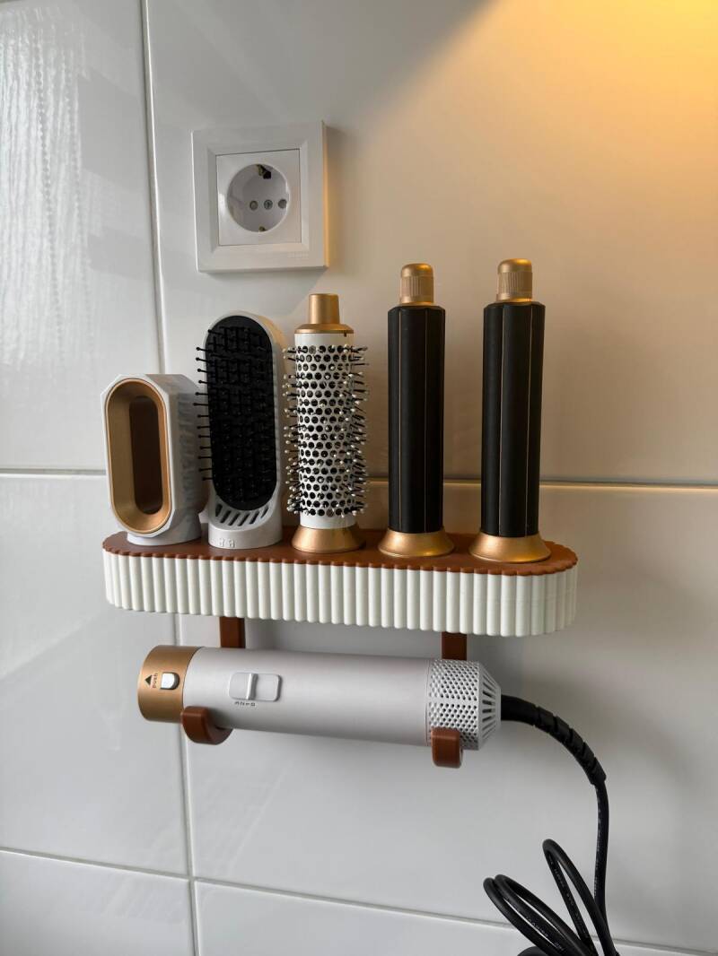 Diese Halterung wurde als kundenspezifischer Auftrag gefertigt und bietet Platz für den Dyson-Föhn sowie fünf verschiedene Aufsätze.